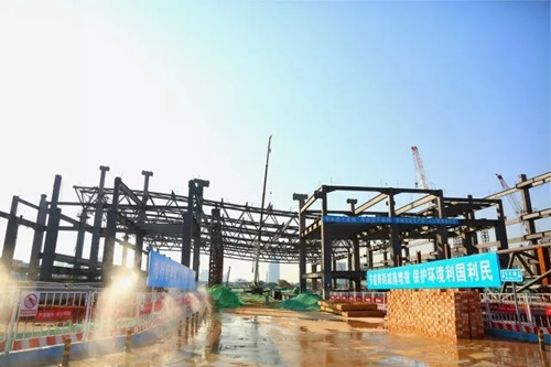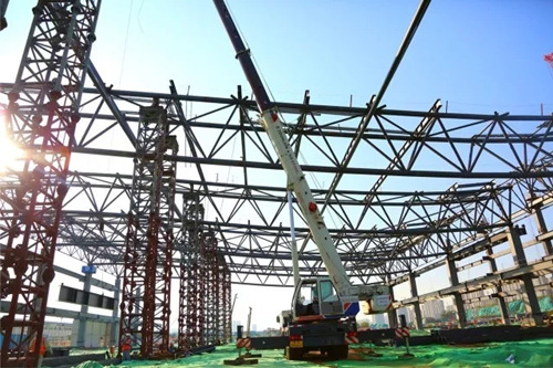 位于项目最南侧,最先开工的五号展馆主体钢结构已基本完成。