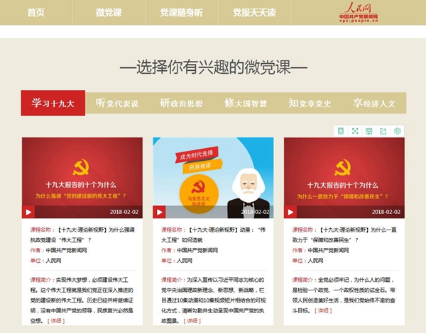 人民网·中国共产党新闻网精心打造的"云党课"栏目,是紧跟新时代,以最新颖的展现形式,为广大党员搭建的最完整、最系统的互联网视频学习平台。平台致力于给广大党员提供最前沿的党课教程,最权威的专家解读,最生动的学习体验。