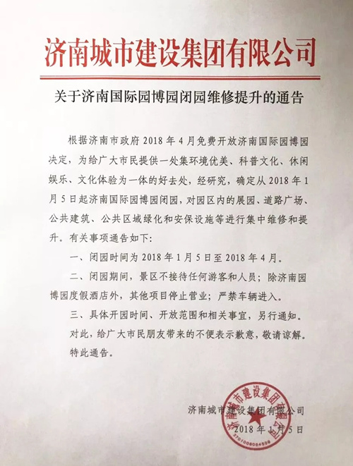 关于济南国际园博园闭园维修提升的通告
