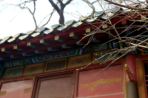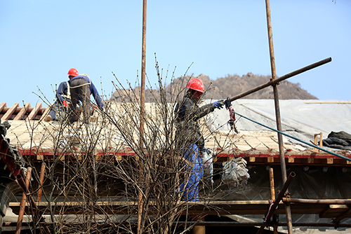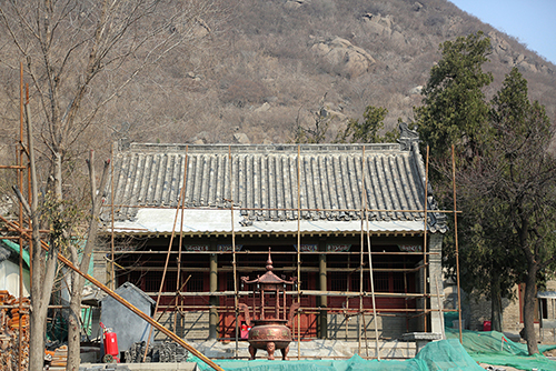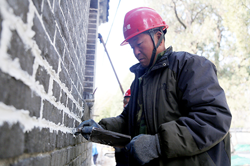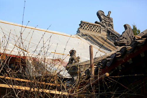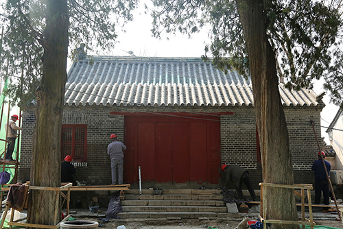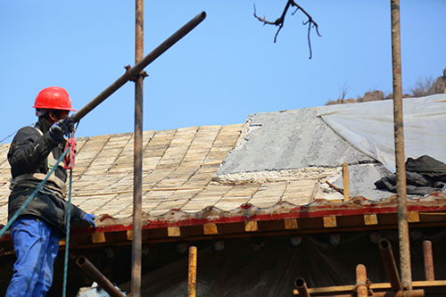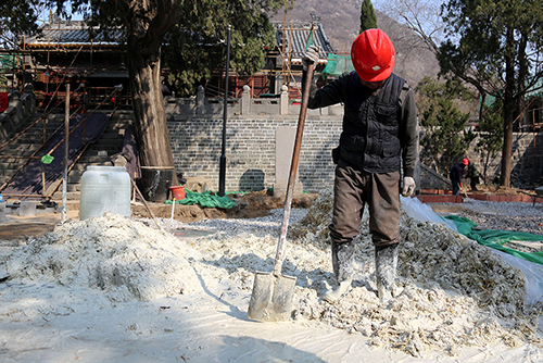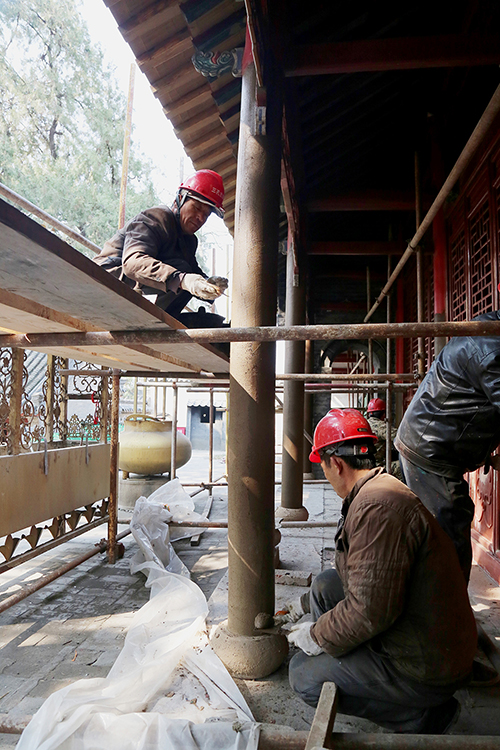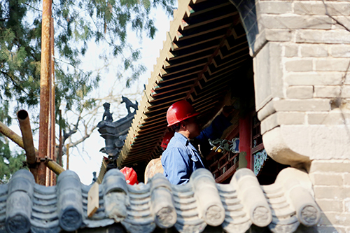 在现场可以看到,冬季过后,“修炼内功”的综合管线敷设、地形塑造、受损的砖作石作木作基底清理工作已基本完成,“湿作业”阶段已经全面展开。目前正在进行中的主要工作为建筑屋面的修缮,建筑墙体的修补,路面、石阶、古砖的清理修复,建筑木构件的砍活与重新上漆,木构件表面彩绘的清理除尘等工作。