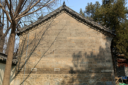 古法之三,砖药与青砖白灰。在华阳宫内的古建墙壁上,很多砖块因为年代久远及腐蚀原因,有不同程度的破损,对墙面破损较轻微的砖块,以修复方式,不作替换,具体用水泥、松烟与砖沫制成与墙面颜色一致的砖药,用磨平与压死的方式修补,还原砖块原样。在墙面修补方面,采用青砖白条灰勾缝进行处理,恢复古建筑外貌。据了解,一位技术工人一天约能完成高度约50公分的青砖白条灰勾缝修补工作。