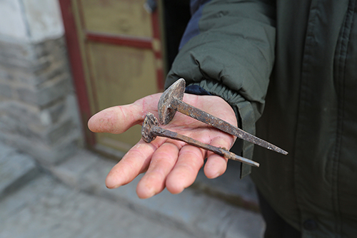 古法之六,盖头钉。华阳宫古建筑中用来固定檩条、望板等构件的盖头钉,保存完好的两三百年都未生锈,此次修复过程中替换的盖头钉仍采用古法锻造,替换部分腐蚀无法使用的旧钉,而这种技艺的盖头钉,目前国内基本只有曲阜的几家作坊还在生产制作。