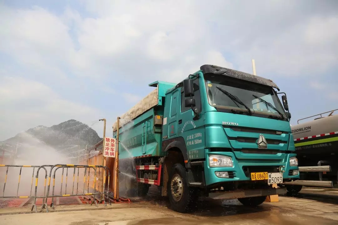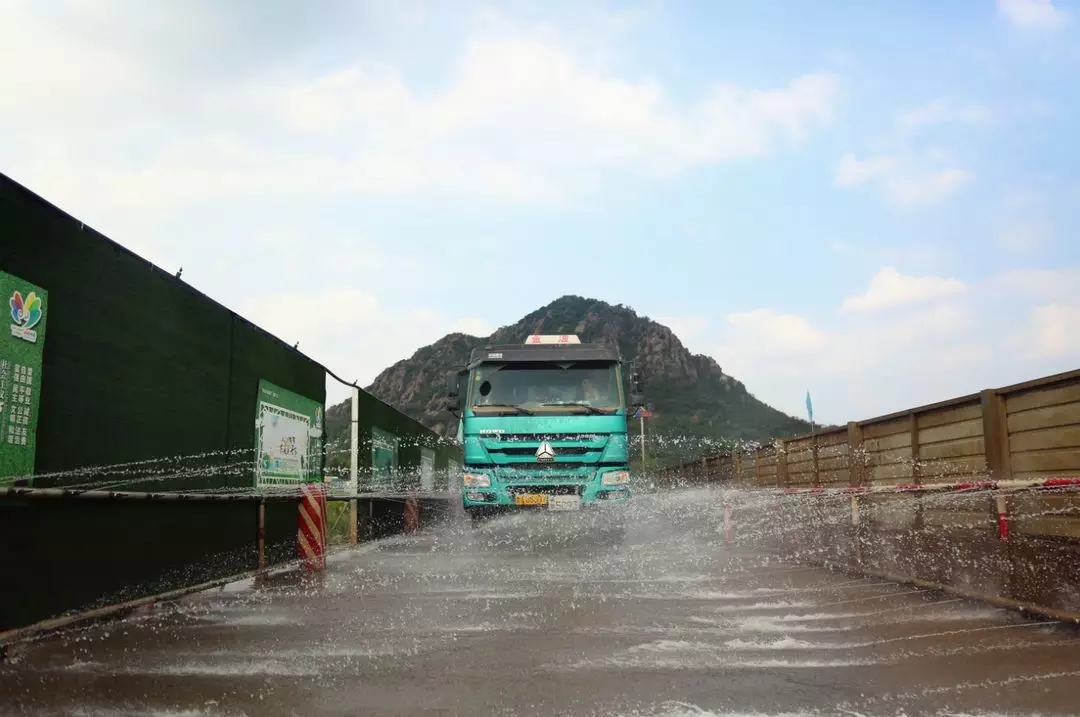 该项目除按照相关要求安装自动汽车冲洗平台、便道两侧设置环场喷淋、出入口安装24小时扬尘在线监测和视频监控设备外,还组织了各参建单位技术力量,创新开发了不停车冲洗设施作为辅助标准化洗车平台,以加强冲洗效果。出入口设置净车检查点,对冲洗不彻底的部位,采用手持高压水枪进行彻底清洗。目前项目的各出入口均已配置2台自动汽车冲洗平台,2台高压水枪和不停车冲洗设施。通过以上措施,实现施工范围内扬尘情况24小时零死角监控,确保外运车辆不带泥上路。