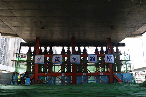 本次顶升的第32联箱梁为120米长的曲线结构,重达7500t。顶升过程涉及到5座墩台,共配备123台液压千斤顶,每次顶升约10厘米,借助专业位移监测设备,保证桥梁整体顶升质量。