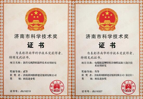 近日,济南黄河路桥集团两项成果荣获济南市科技进步奖,分别为银河路桥主要负责的“沥青无机降粘温拌技术应用研究”荣获济南市科技进步奖二等奖,获5万元奖金;二分公司主要负责的“电缆隧道侧壁组合钢模混凝土浇注技术应用研究”荣获济南市科技进步奖三等奖,获2万元奖金。