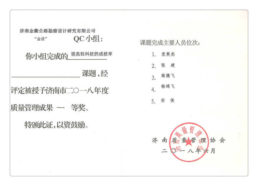 近日,济南质量管理协会组织召开了2018年度全市群众性质量管理活动经验交流会,表彰群众性质量管理活动中涌现出的优秀QC小组、质量信得过班组、先进工作者及优秀QC成果。金衢公司成立“金设”QC小组参与评选,申报的多个课题受到表彰:其中“提高粒料桩的成桩率”课题荣获“济南市2018年度质量管理成果”一等奖;“提高路面结构内部排水效率”课题荣获“济南市2018年度质量管理成果”二等奖;“公路路基滑坡治理研究”、“提高公路设计工作的效率”、“有效防止小箱梁支座脱空现象”、“提高后期服务满意率”四个课题分别荣获“济南市2018年度质量管理成果”三等奖;同时,金衢公司设计一室、设计二室被授予“济南市2018年度质量信得过班组”荣誉称号,刘腾、王敏、张伟伟三人被授予“2018年济南市优秀质量管理工作者称号”。