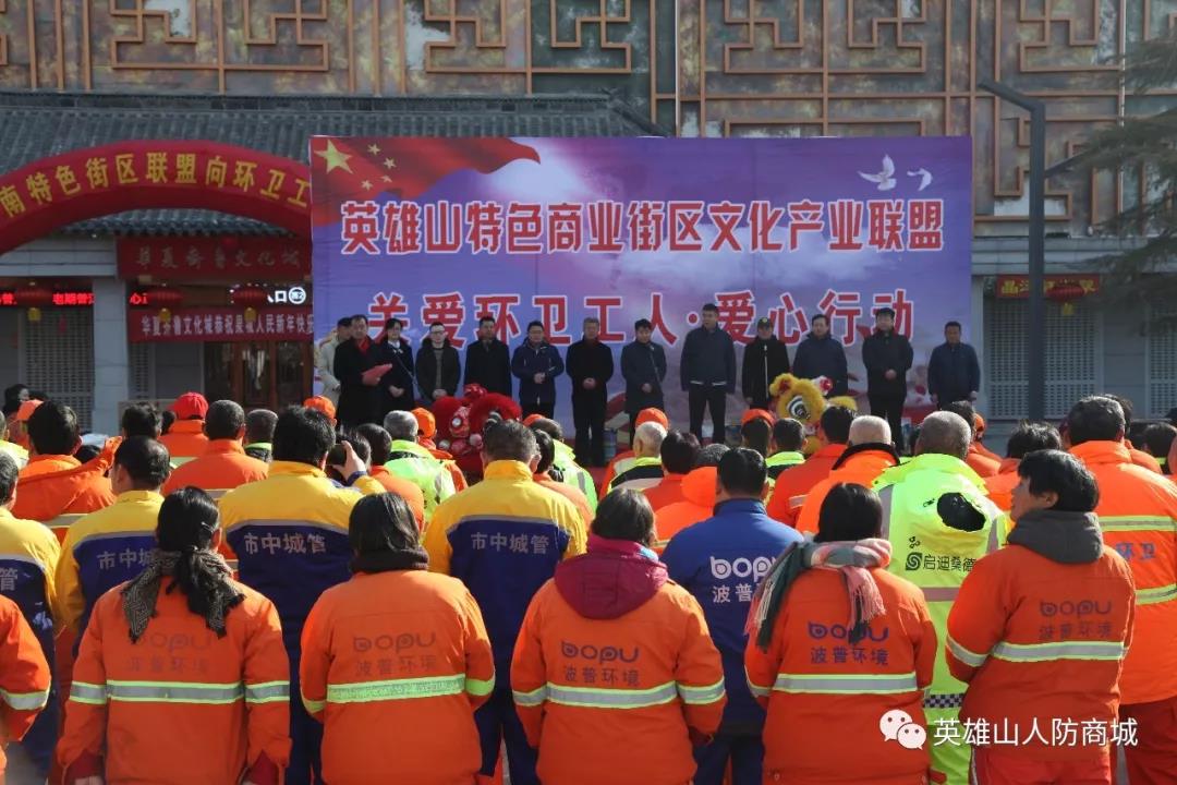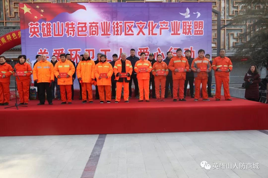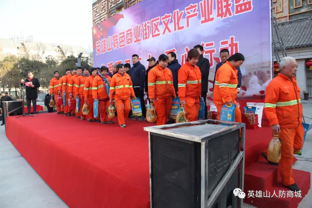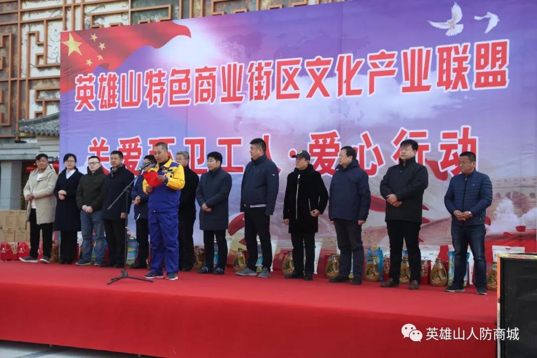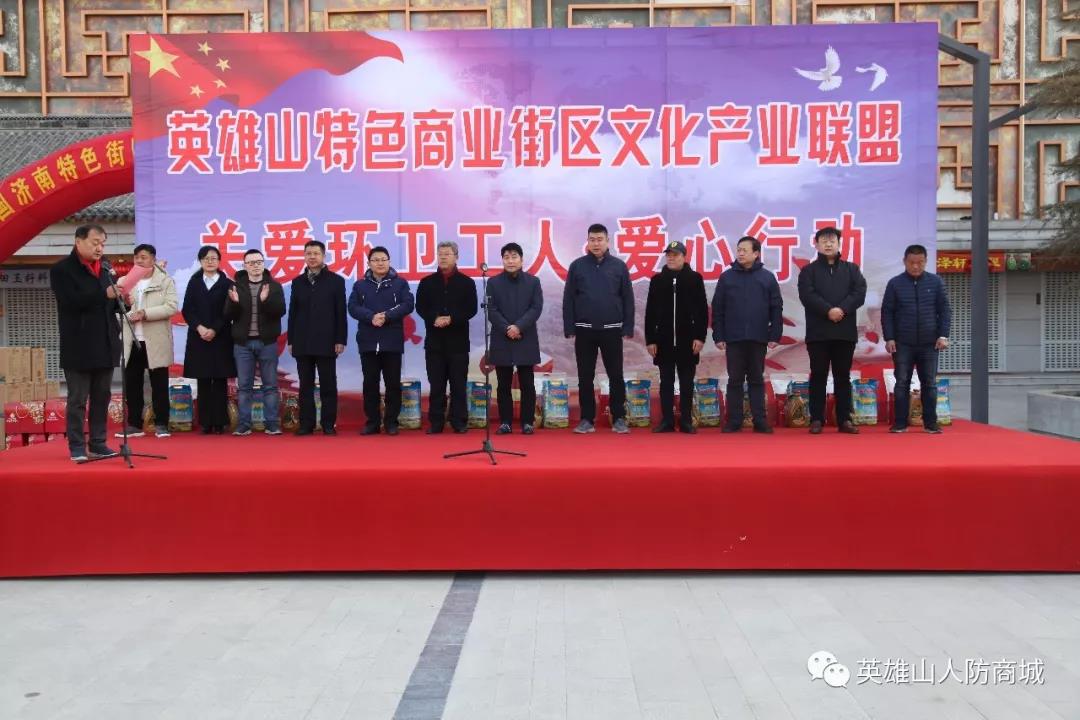 2019年2月1日,农历腊月二十七,济南市英雄山人防工程管理有限责任公司作为英雄山特色商业街区文化产业联盟成员单位,与多家联盟单位联合发起了中国济南特色街区联盟“关爱环卫工人,爱心行动”主题公益活动,为服务于街区的环卫工人们献上节日的祝福,并送上了个人捐款与农副产品。市中区副区长潘建军、四里村街道办事主任崔珉受邀参加了本次活动。