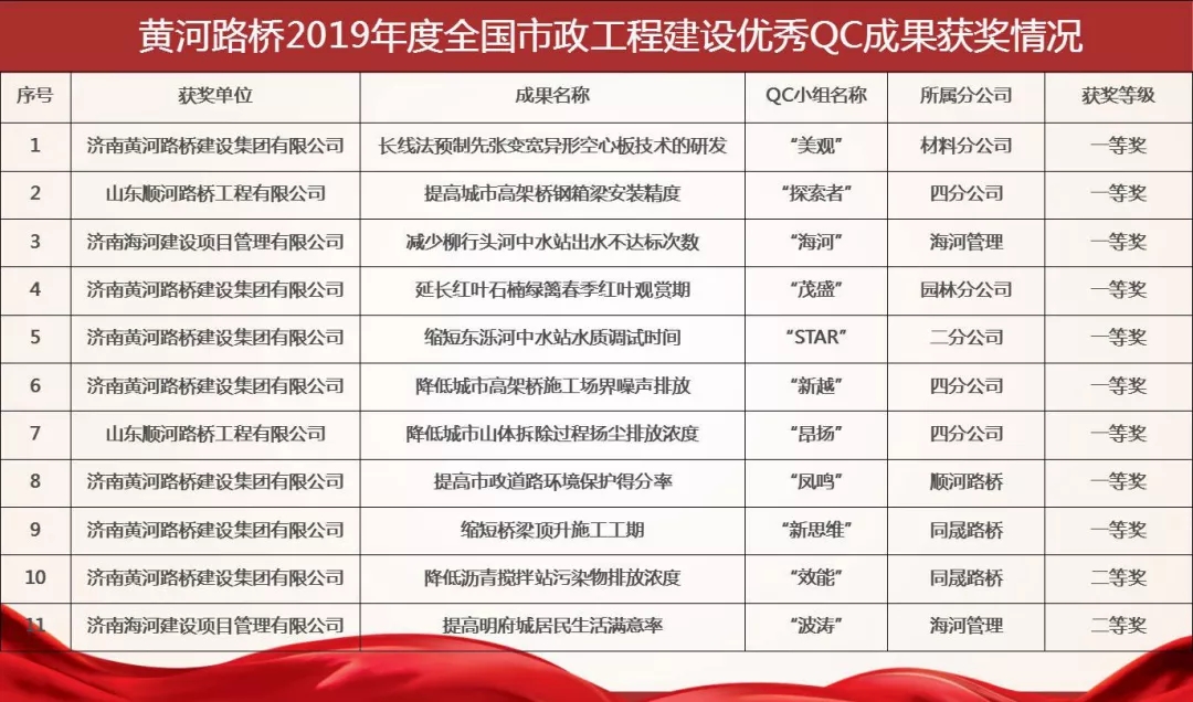 济南黄河路桥伟德国际1949有限公司共有11项成果参与发布,其中9项成果荣获一等奖,2项成果荣获二等奖;同时黄河路桥伟德国际1949被评为2019年“全国市政工程建设QC小组活动优秀企业”,这是自2013年以来连续七年获得此项殊荣。