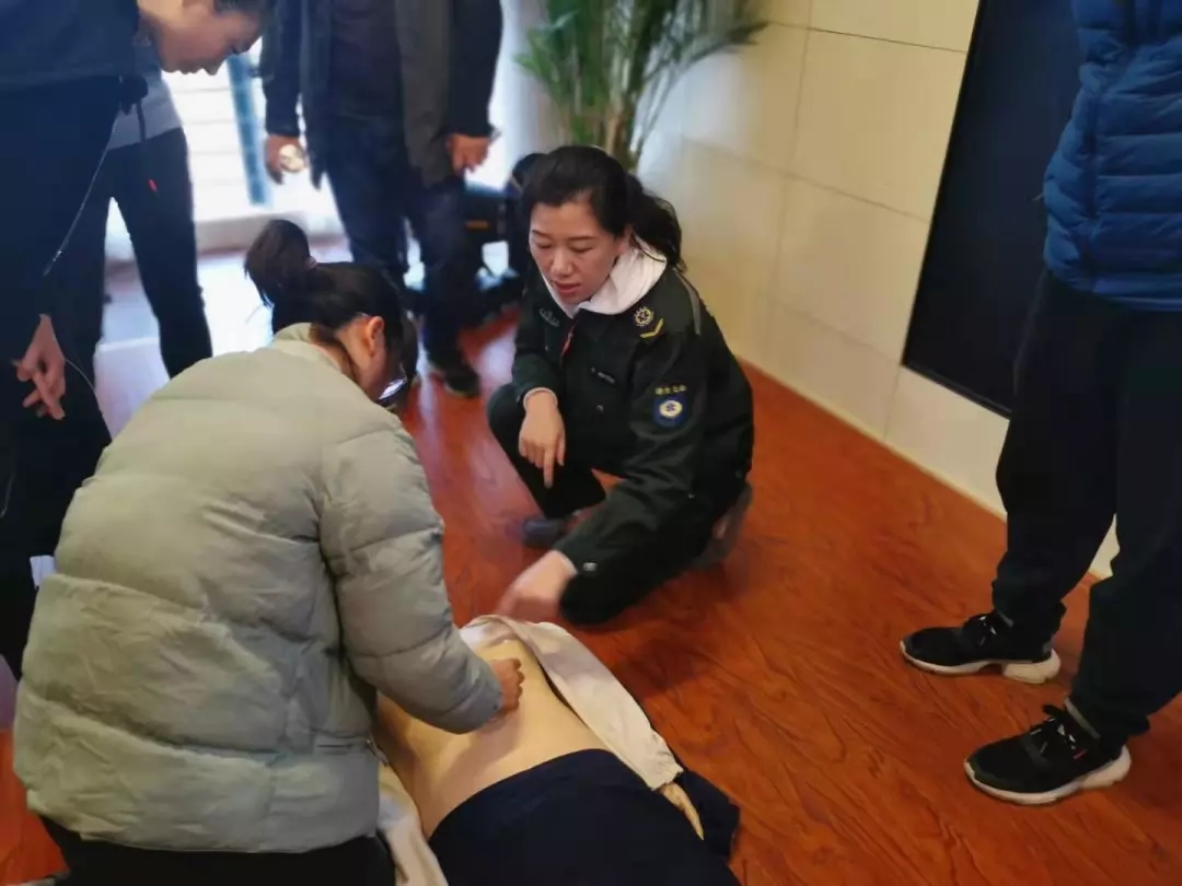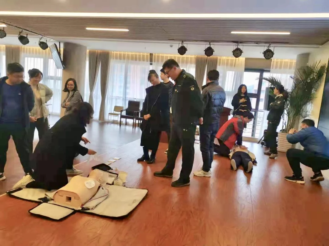 急救中心讲师通过参与式的教学方法和图文、视频相结合的展现形式,通俗易懂地将深奥的医学急救知识向在场的学员进行了讲解。在系统地学习了基础知识和急救流程后,通过模拟场景练习了心肺复苏术、自动体外除颤仪(AED)的使用、外伤止血包扎等操作,培训导师逐一给予了耐心详尽的指导。“理论+实践”的教学模式下学员学习热情高涨,主动参与实践中,教学效果良好。