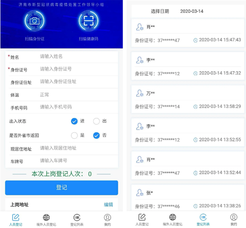 为切实保障济阳区济阳、济北11个社区居民的生命安全和身体健康,上岗前,每名志愿者都在手机上安装了“济南易通行”APP,利用高科技软件对社区居民每天的进出状况做好登记,既方便又快捷。