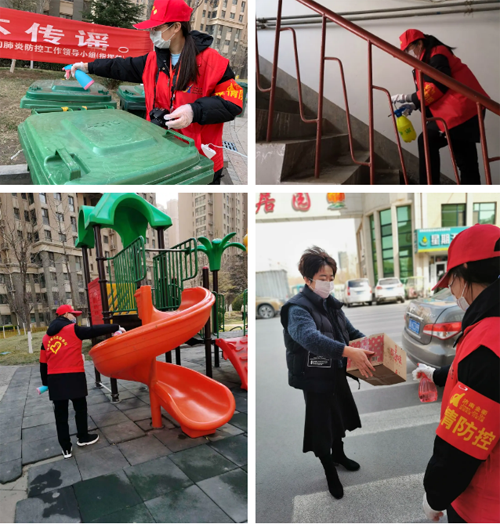 在做好志愿服务之余,志愿者们采用1:200配比的84消毒液坚持每天两次对社区广场健身器材、垃圾桶把手、楼道等重点区域进行消毒,为社区居民创造健康、安全的文体活动环境,筑牢疫情防控安全防线。