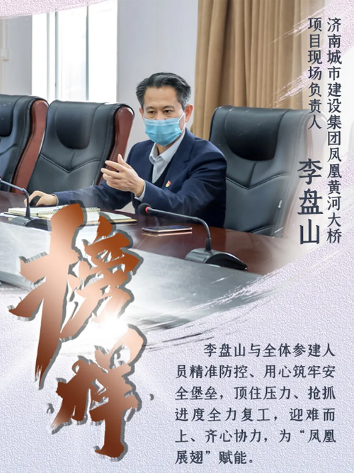 1月24日,山东省启动了重大突发公共卫生事件一级响应,按照市委、市政府相关精神和集团公司安排部署,1月26日凤凰黄河大桥项目指挥部成立疫情防控工作小组,李盘山担任组长。随后,他立即组织各参建单位开展疫情防控工作,带领大家迅速调整工作状态,用最快的速度制定防疫制度,并紧急为施工单位落实了15000余副医用口罩、酒精等防疫物资储备,在项目布置了30余条横幅、20余块展板宣传防疫知识,并联系济南第七人民医院来到项目讲解防疫知识。同时督促各施工单位做好施工人员摸底排查,建立一人一卡,确保外地工人安全及时返回工作岗位,保证各重点区域消杀到位,严格执行双测温两报告制度,确保疫情防控扎实有效。