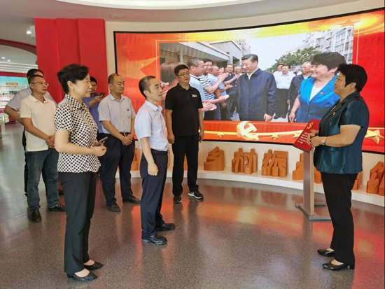 在三涧溪村,工作人员带领大家重走习近平总书记的考察足迹。在村委会党群服务中心,深入了解了三涧溪村的成长史、党组织的发展历程、党组织建设经验和先进做法,以及“四邻联动”等为民服务体系。在乡村振兴主题展馆,工作人员为大家讲解了习近平总书记亲临三涧溪村视察指导的有关情形,并结合实物、图片、视频、展板等载体讲述了三涧溪党委不忘初心,牢记使命,担当作为,团结带领村民脱贫致富的奋斗历程。期间,工作组与三涧溪村党委书记高淑贞就党建引领、乡村振兴等方面进行了畅谈交流,参观结束,全体人员在党旗前重温了入党誓词。