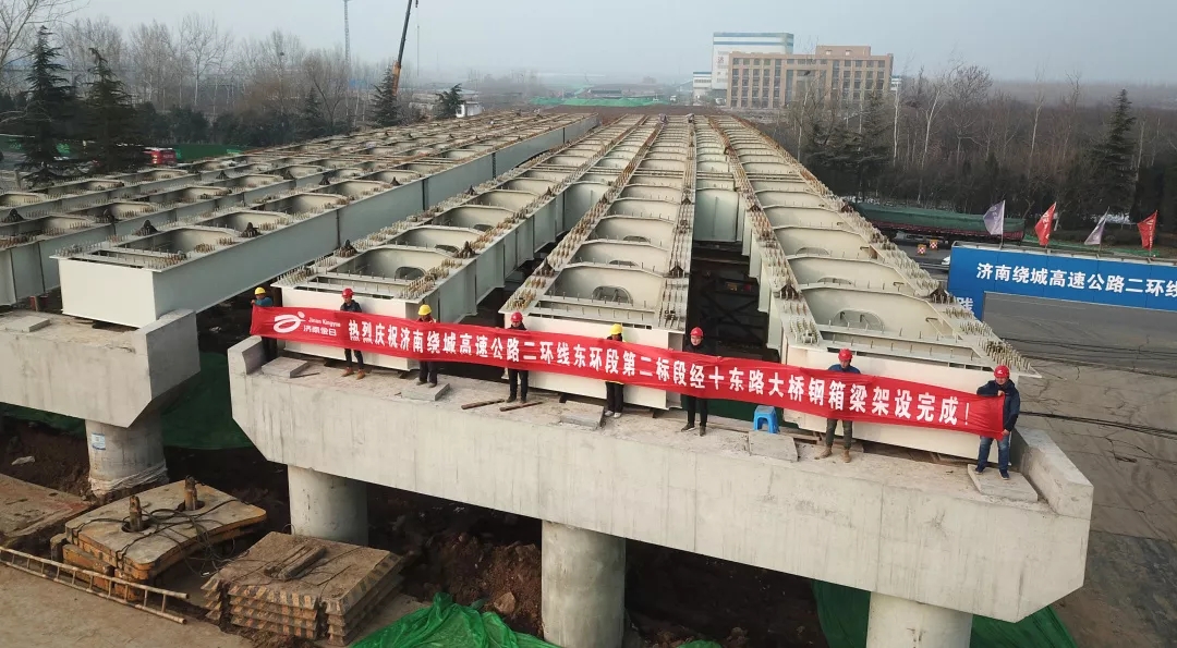 1月18日,济南绕城高速公路二环线东环段二标段(济南“大东环”)互通主线桥跨经十路钢箱梁顺利合拢。至此,项目跨越经十东路大桥钢箱梁架设工作全部完成,为实现年底通车的目标打下了良好基础。