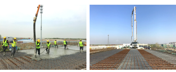 该标段全线10kV以上高压线共计15条影响主线2400米施工,项目部多措并举顺利攻克难关,大力推进施工进展。自项目开工以来,北岸引桥4#墩一直受上空高压电缆制约施工,项目部多次勘探现场,编制专项施工方案。桩基钻孔采用循环钻开挖,为避免触电危险的发生,设备上方铺盖绝缘板后施工;扣除吊装高度,桩基钢筋笼全部采用2米一段,于钻孔内进行连接拼装;线改后为了迅速形成强度,4#墩下部结构混凝土强度标号提升至C40。