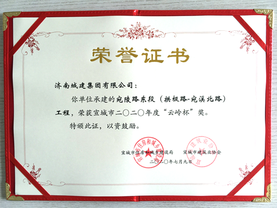 近日,由集团所属济南城建集团有限公司承建的宣城市水阳江大道闭合段北段工程PPP项目、宛陵东路(拱极路—宛溪北路)工程荣获宣城市2020年度“云岭杯”奖。