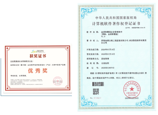 2020年,金诺公司与西安凯悦软件有限责任公司合作,研发了“金诺智慧通”企业管理软件,于2020年12月取得中国版权保护中心颁发的软件著作权登记证书。“金诺智慧通”参加了第一届中国(山东)数字经济优秀项目(产品)大赛,并获得产品组“优秀奖”。同时,2020年下半年推动的针对公路工程建设开发的“路面三维剖面破损(病害)自动检测系统”、“桥梁在线监测系统”等8个软件已申报软件著作权登记,软件著作权登记证书已于2021年3月份下发。