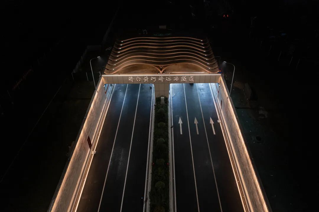 济南黄河济泺路隧道设计方案以黄河文化根脉为基,黄河之“光”为“场”,融合黄河历史、文化、自然、艺术等表现黄河两岸是我家。“黄河根脉 岁岁安澜”主题设计定位为城河相融,动静相融,蕴含“天人合一”的设计理念,让黄河隧道艺术空间景观和自然互为补充。设计中借黄河水纹传统纹样,将黄河文化与自然生态中的场地、色彩、光影结合,再造了黄河地形与黄河流动的自然之美,描绘了新时代黄河画卷中诗情画意的城市底蕴。