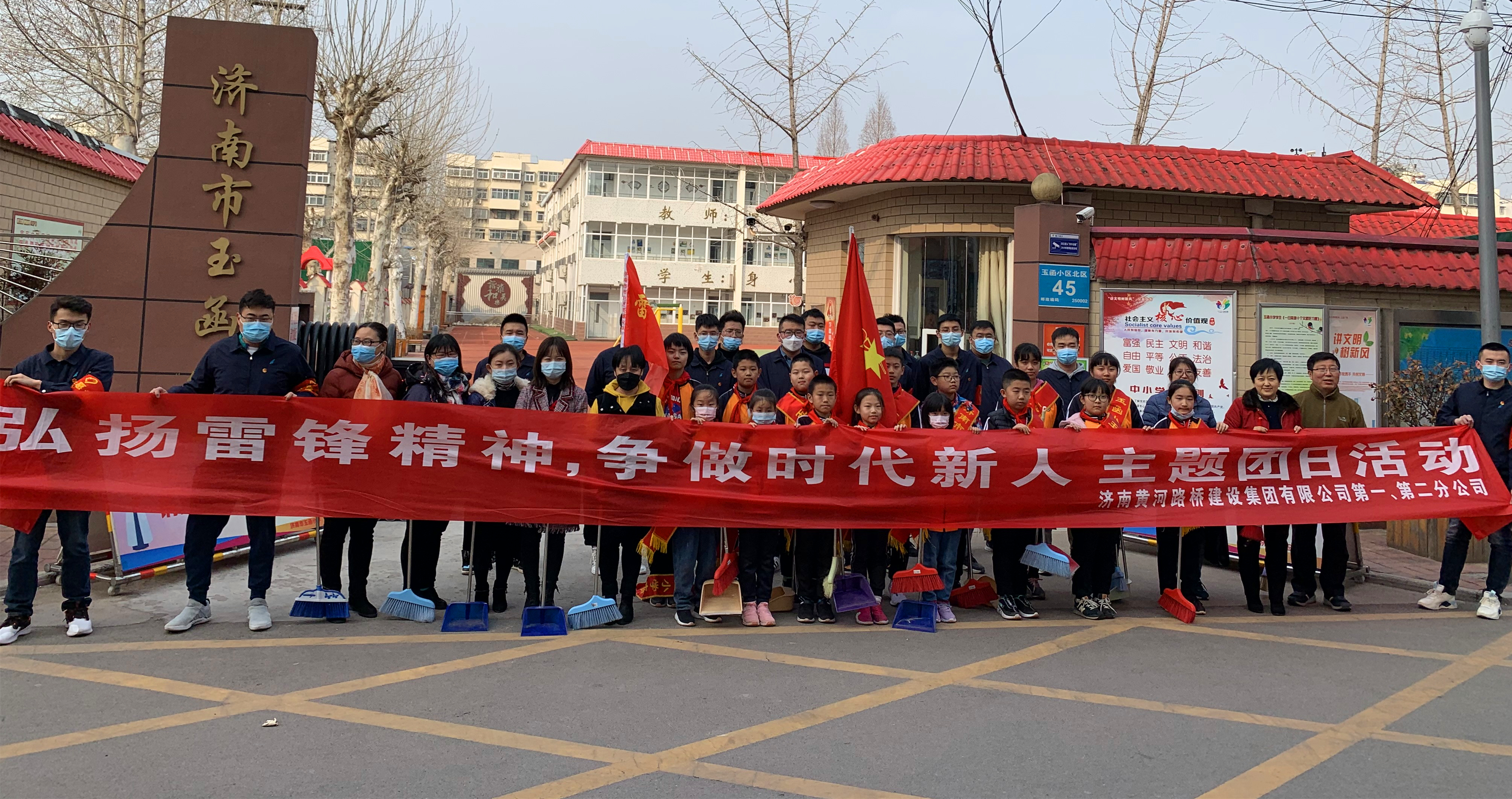 团员青年们来到济南市玉函小学门口,按照活动任务分组,打扫学校及周边卫生,同时向周边行人及来往车辆发放《学习雷锋倡议书》。活动中,大家耐心又热情地讲解学习雷锋的重要性和必要性,此举获得家长们的一致称赞。