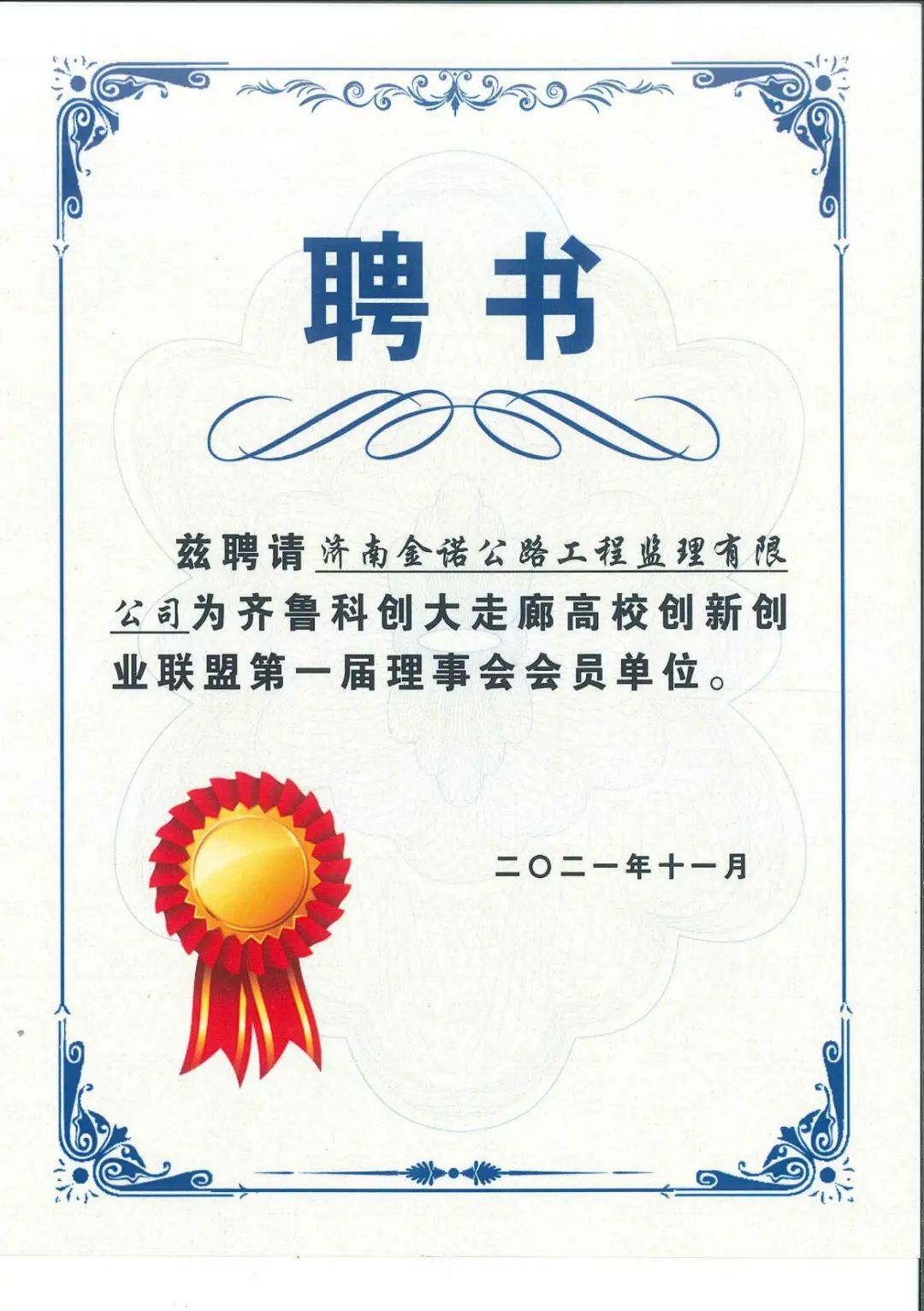 近日,齐鲁科创大走廊高校创新创业联盟成立大会在山东青年政治学院召开,济南金诺公路工程监理有限公司当选为第一届理事会会员单位。