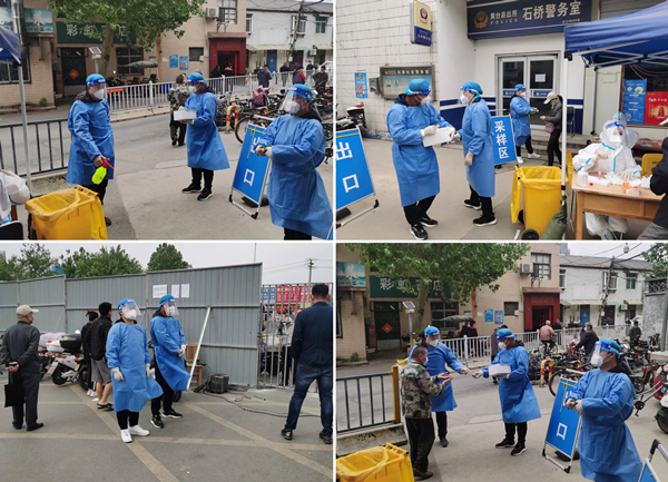 在石桥社区,身着蓝色工作服的青年突击队志愿者分工明确、相互配合,穿梭忙碌在核酸采样现场:协助检测、体温测量、有序引导、登记信息、维持秩序、耐心讲解。尽管现场下起了小雨,志愿者们冒雨作战,保持采样工作有条不紊、顺利推进,在规定时间内圆满完成社区采样任务,为石桥社区绘出一片坚实的守卫蓝。