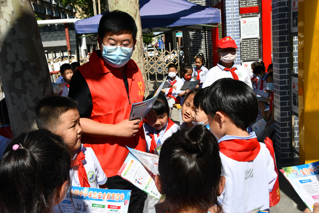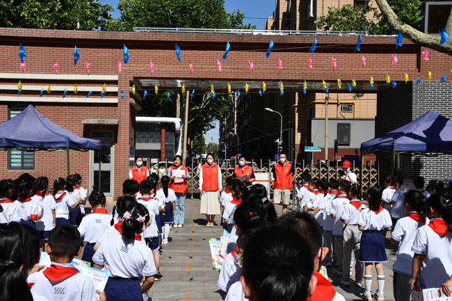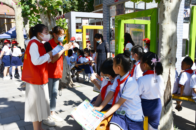 手牵手,心连心,一起成长。本次志愿者活动与全国安全月密切结合,提前印制“喜迎二十大 争做好队员”、“新型冠状病毒预防指南”、“中小学生安全教育宣传”等知识手册,在现场进行发放,向小朋友们普及相关知识。
