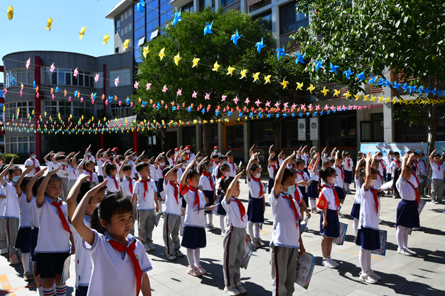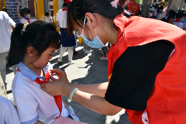 活动中,志愿者身着红色志愿者马甲,与小朋友们进行亲密互动,为孩子们佩戴少先队队徽,以通俗易懂的方式为大家讲解少先队知识、安全防疫知识,提醒提高安全防护意识。志愿者们与小朋友们有说有笑,其乐融融,为小朋友们送去集团的关爱和祝福,祝愿孩子们开心快乐成长。孩子们用整齐的少先队礼回应志愿者,稚嫩的童颜上洋溢着灿烂的笑容。