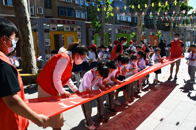 活动最后,小朋友们在“以团带队 薪火相传 安全‘童 ’行 ”的条幅上签上自己的名字,胸带少先队徽,一笔一画的认真书写,鲜艳的红色条幅映红了孩子们的脸庞,在孩子心中播种下美好的种子。