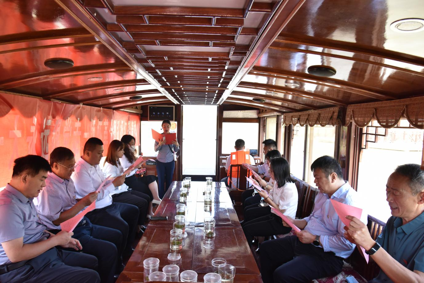 活动中,党员干部模拟再现嘉兴南湖红船会议场景,围绕“喜迎二十大 永远跟党走——缅怀革命先烈 弘扬红船精神 ”主题开展朗诵活动。