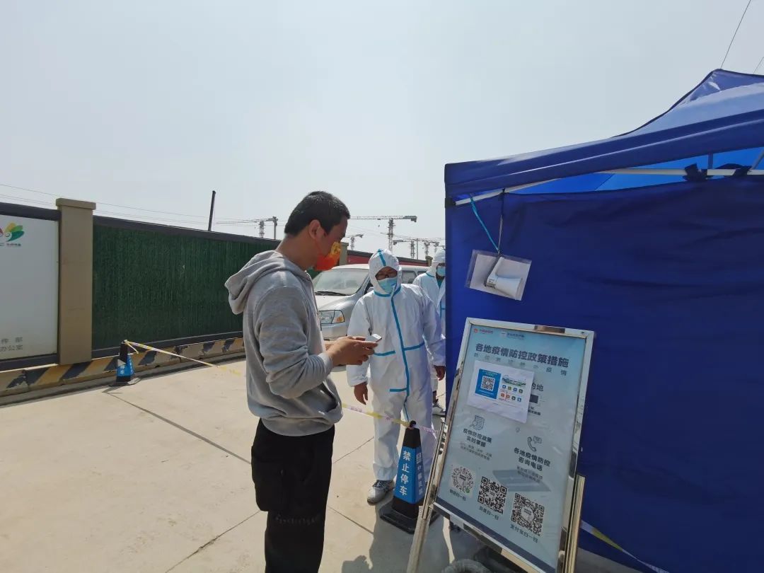 在济南市新旧动能转换起步区大桥安置五区项目入口,几名身穿防护服的工作人员严格对进出场人员进行信息自动化登记和健康信息核验。