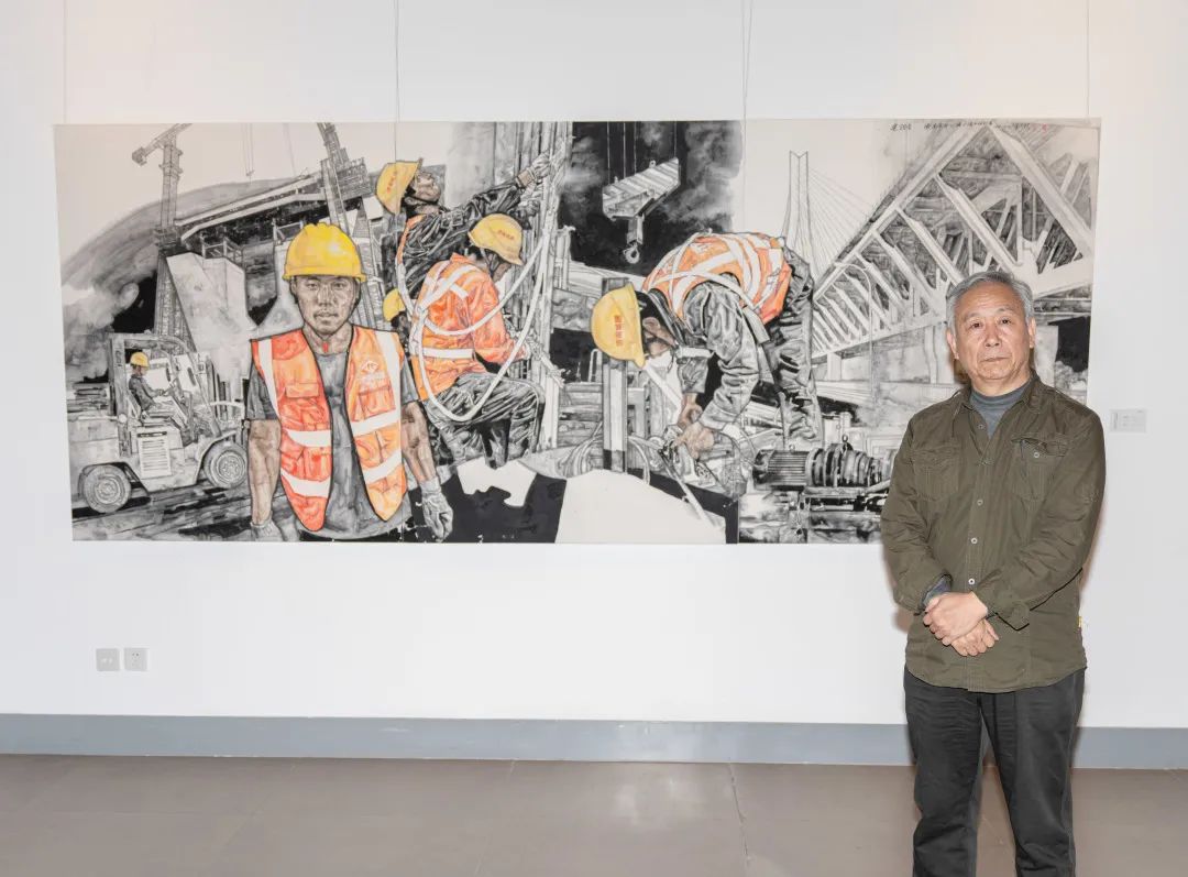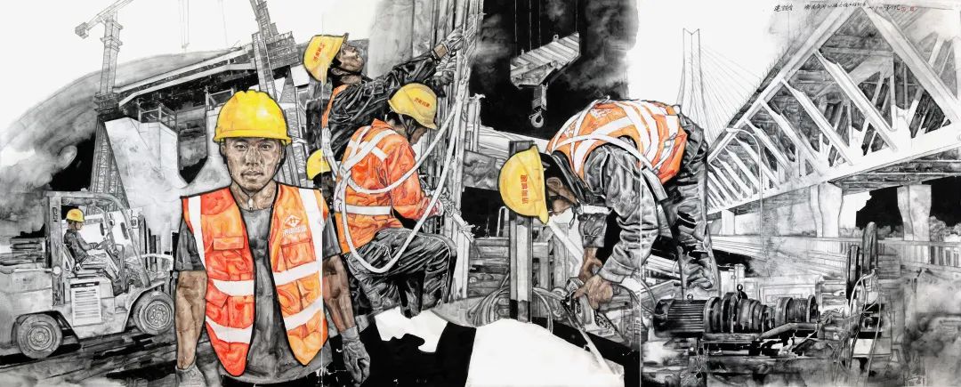 山东省中国画学会副会长、山东省美协综合材料绘画艺委会副会长李兆虬走进济南黄河大桥改扩建工程建设现场,采风创作了《建设者—济南黄河公路大桥建设纪实》作品。