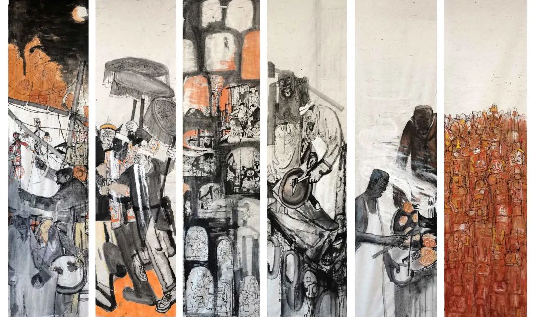 中国美术家协会会员、山东画院签约画家、济南市美术家协会理事何邦辉的《非遗系列》作品,展现了兔子王、济南皮影、章丘铁匠、龙山黑陶、油旋甜沫、鼓子秧歌等6种济南非物质文化遗产。