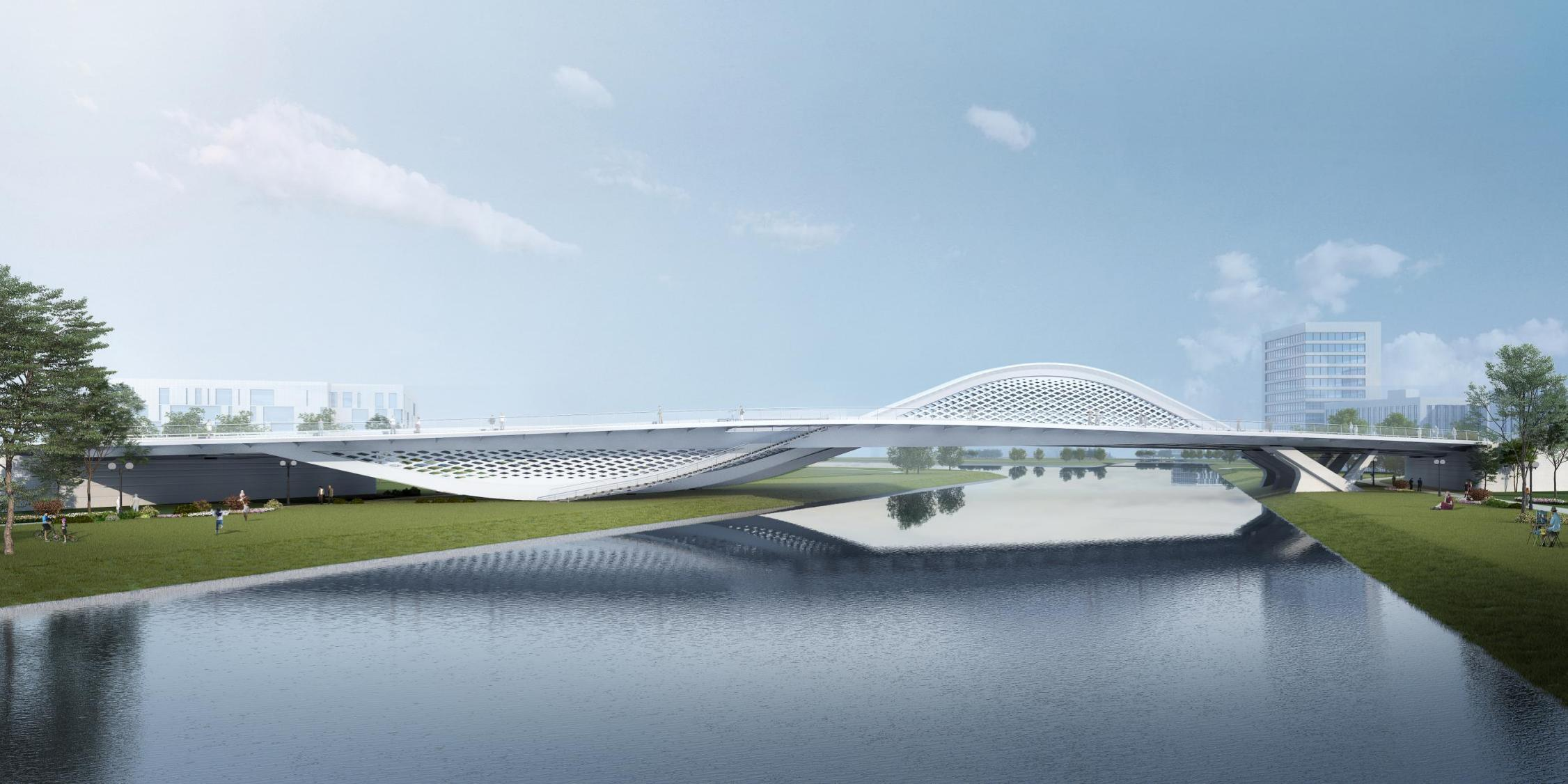 横一路、横二路大寺河桥作为起步区规划的第一批景观桥梁,由伟德国际1949有限公司受委托建设,两座桥梁由世界著名桥梁设计师Marc MIMRAM先生主设计,通过研究济南的历史和文化,以泉与太极这个设计为根基,将泉城的刚中有柔、柔中带刚,与太极互为印证,力与美相结合,完成两座景观桥梁的设计。