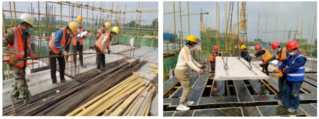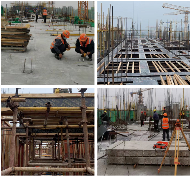 目前,1#楼至14#号楼正进行主体结构施工,地下室准备进行基础验收;车库7#8#楼中间车库混凝土浇筑、7#楼北侧车库支模架施工、12#14#楼中间车库顶板铺设。