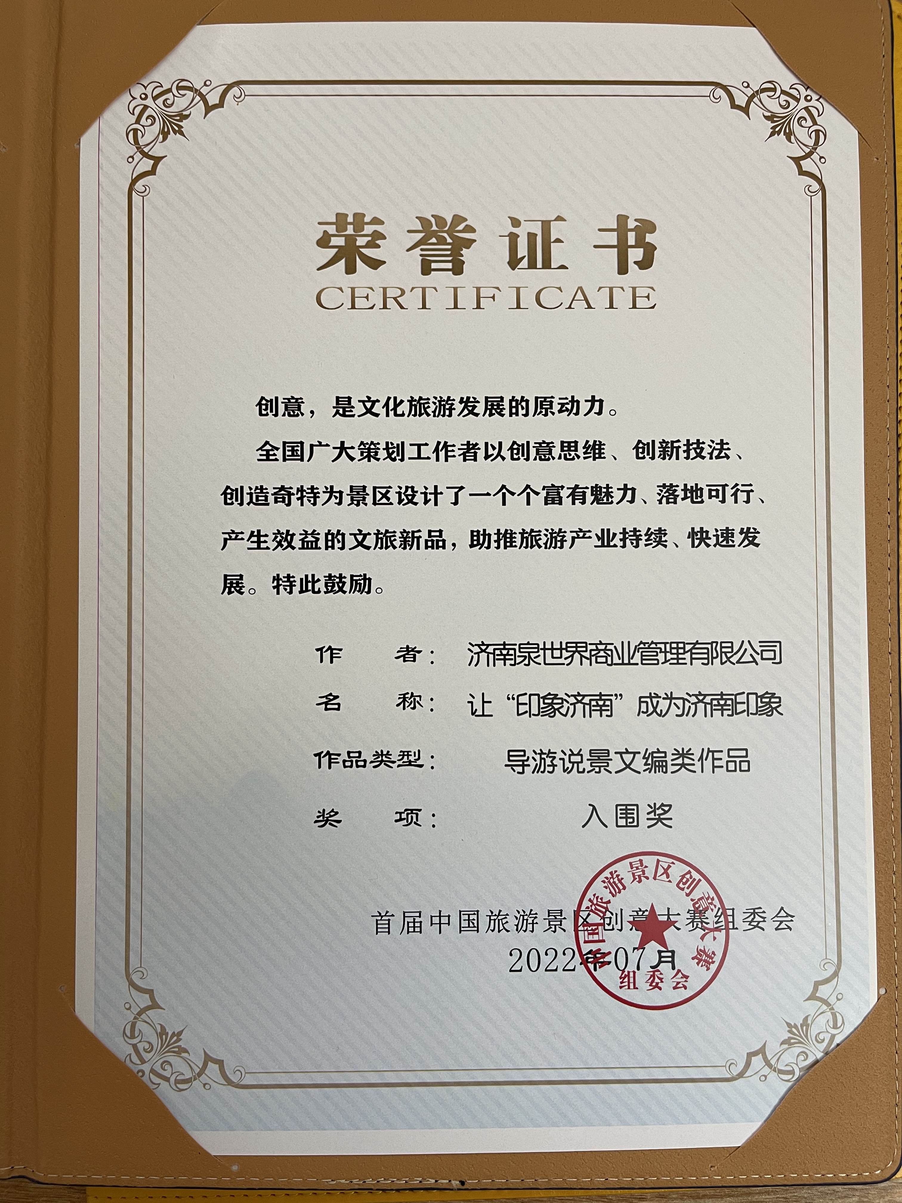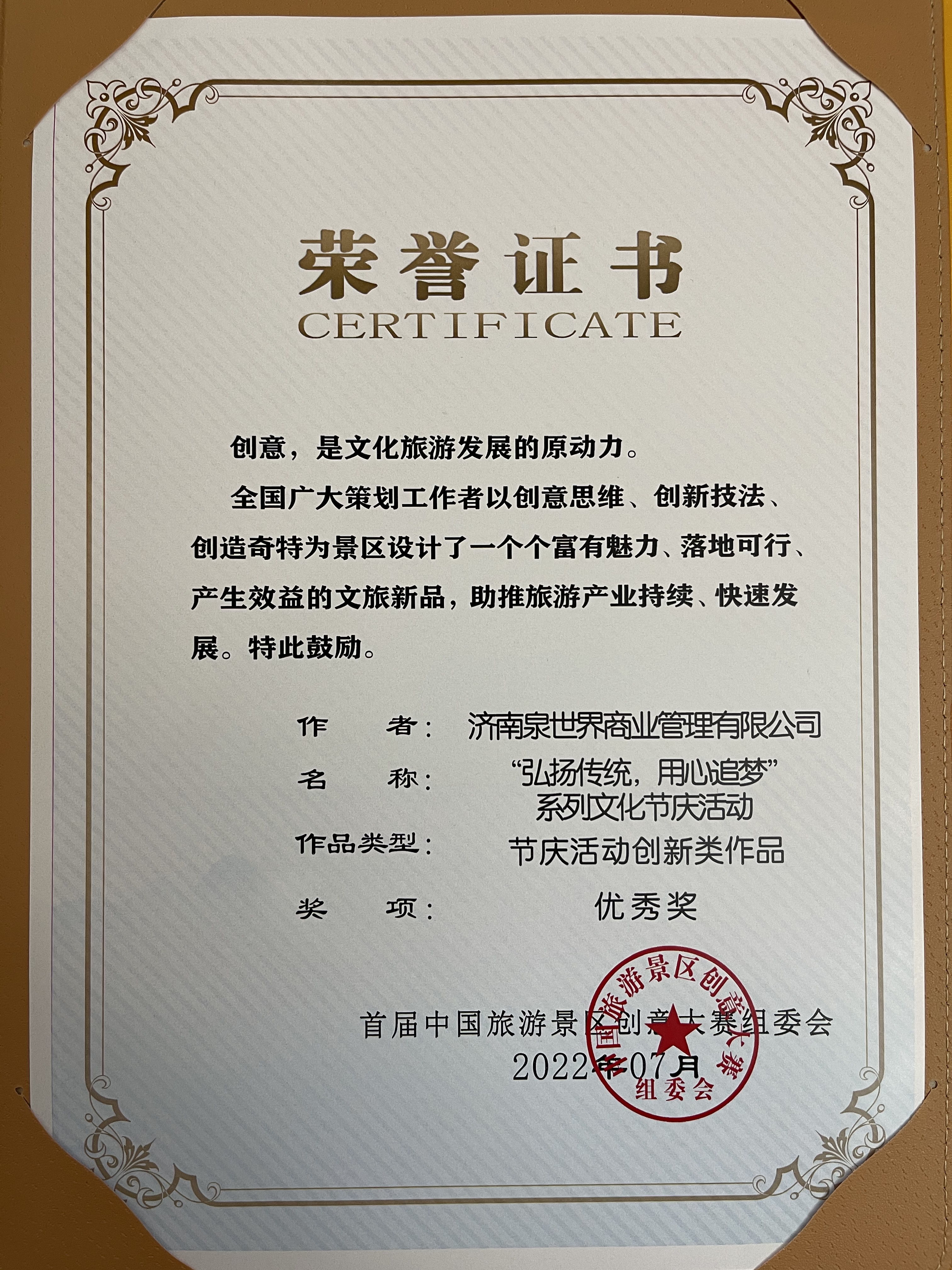 为推动文旅产业提标提效发展,丰富文化内涵,激发创意思维,增强旅游市场活力,近日,由中国旅游景区协会主办的首届中国旅游景区创意大赛颁奖典礼暨创意论坛在白音哈达旅游度假区举办。济南泉世界商业管理有限公司运营管理的印象济南·泉世界景区,正在积极创建国家4A级旅游景区,一直以来十分注重景区运营管理工作创新发展,组织了五项内容参加了此次创意大赛,与全国各大知名旅游景区提交的200多份创意作品进行角逐,最终有四份创意作品获奖。其中:《节庆活动创新类作品》《营销模式开发类作品》获得优秀奖,《导游说景文编类作品》《旅游线路拓新类作品》获得入围奖。
