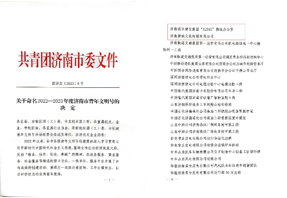 近日,共青团济南市委印发了《关于命名2022-2023年度济南市青年文明号的决定》,集团“12345”热线办公室、济南新城文化传媒有限公司两家集体获评2022-2023年度济南市青年文明号。