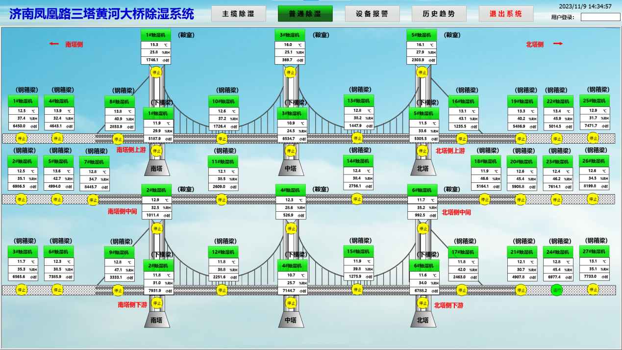 为保持桥梁结构强度,防止钢箱梁、内部钢架、主缆锈蚀,延长桥梁使用寿命,大桥安装有3套主缆除湿系统、6套鞍室除湿系统、6套主塔除湿系统、27套钢箱梁除湿机。所有除湿机都使用网格连接,通过逻辑控制系统实现数据共享、自动化除湿等任务,时刻消除设备顽疾病害,提高行车安全系数。