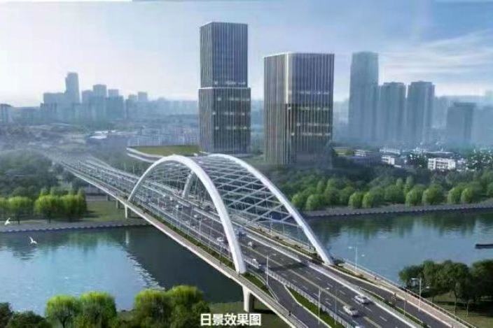 二里桥路跨京杭运河节点工程是京杭运河上单跨径最大的桥梁工程,项目起点顺接二里桥路,向东延伸至京杭北路,长840米,宽40米,工程总投资约2.85亿元。桥梁设计方案为“镜湖明月”,采用“钢箱提篮拱”结构,造型美观,与运河两岸建筑和环境巧妙融合。