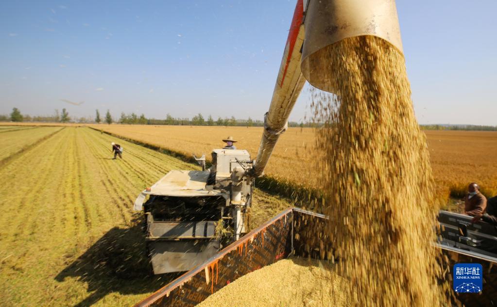 山东省临沂市郯城县郯城街道农民将收获的水稻装车(2022年10月23日摄)。新华社发(张春雷 摄)