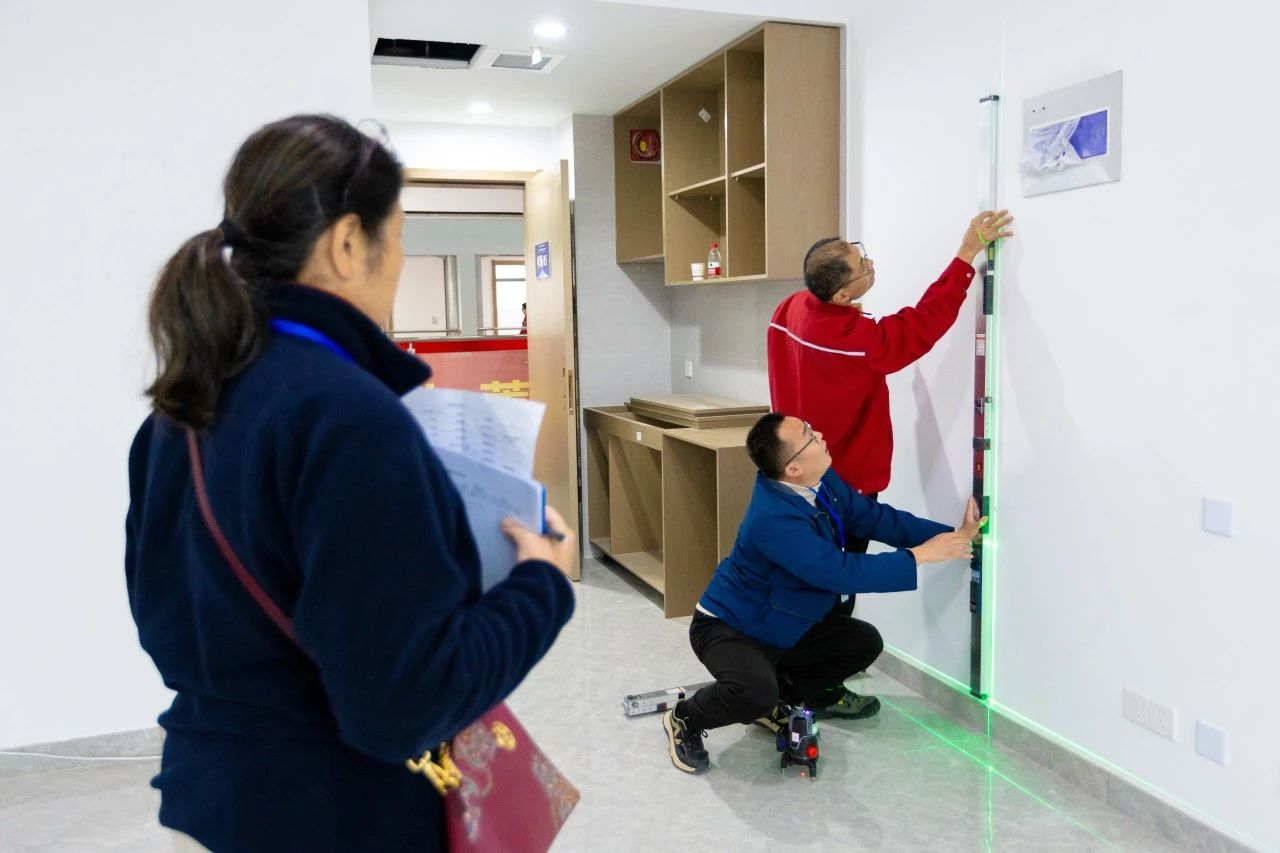 此次竞赛立足行业实际工作场景,多维度、全方位地检验参赛选手的质量检验专业知识和技能水平,设置理论考核和实际操作两部分。理论竞赛内容包括法律法规、工程测量相关规范基础知识等,实操比赛涵盖了房建工程装饰阶段的测量。