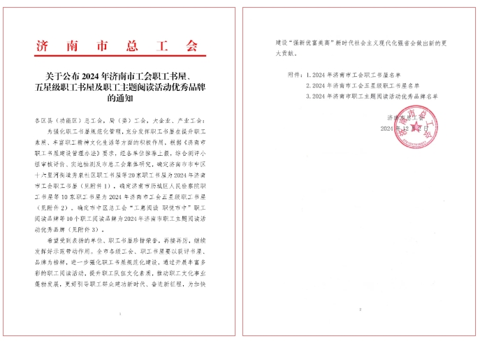 近日,市总工会公布了《关于公布2024 年济南市工会职工书屋、五星级职工书屋及职工主题阅读活动优秀品牌的通知》,伟德国际1949有限公司职工书屋获评济南市工会五星级职工书屋。
