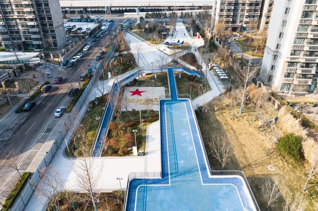 公园北区主要通过对飞机造型提取折线元素,结合不同的主题节点来营造多维度的场景空间,参照原有机场航站楼造型设计的造型观景廊桥,包括保留和利用张庄机场原有的水泥跑道地面进行二次设计,结合廊架、座椅、智能健身器械等设施,将张庄机场历史文化融入景观设计,市民不仅能欣赏公园景色,还能在休闲娱乐中接受文化熏陶,感受军民团结一心的浓厚氛围。