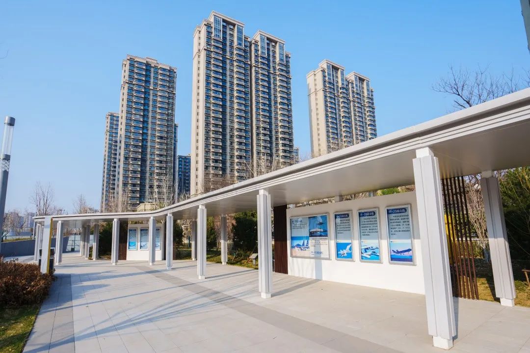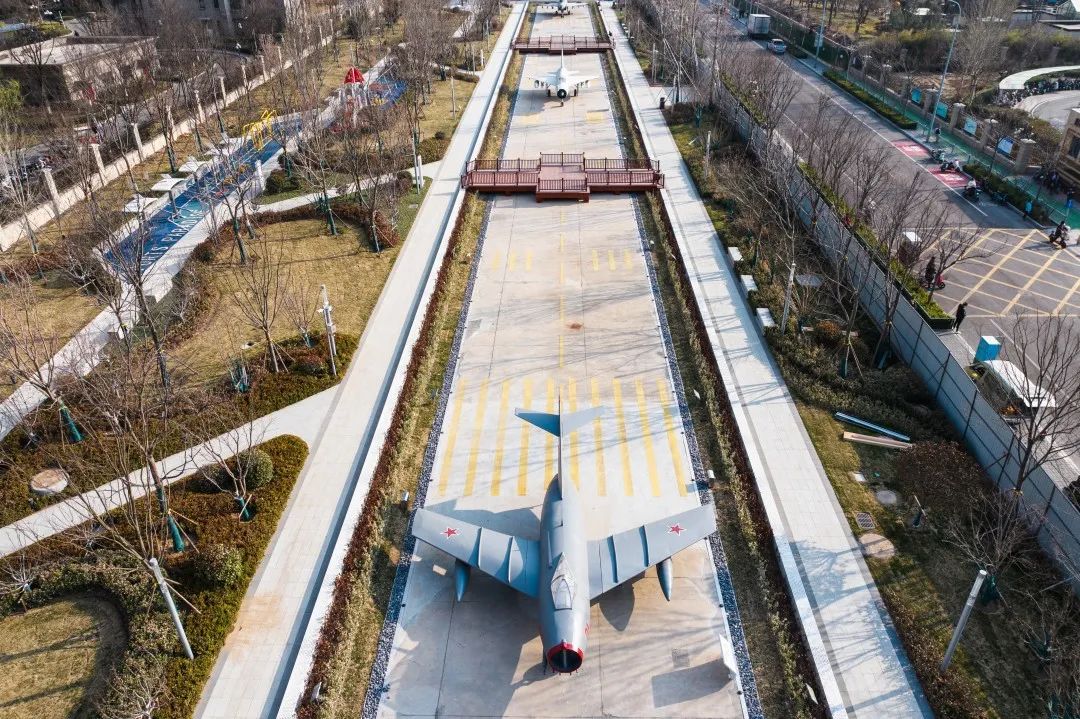 公园南区入口打造文化长廊,通过展示中国战机发展史让市民了解空军文化;结合原有170米长水泥跑道,通过景观手法进行二次设计,融合机场跑道符号、导航等设施还原机场跑道场景,沿跑道科普展示曾在张庄机场服役的战机模型,进行航空科普、国防军事及爱国主义教育。