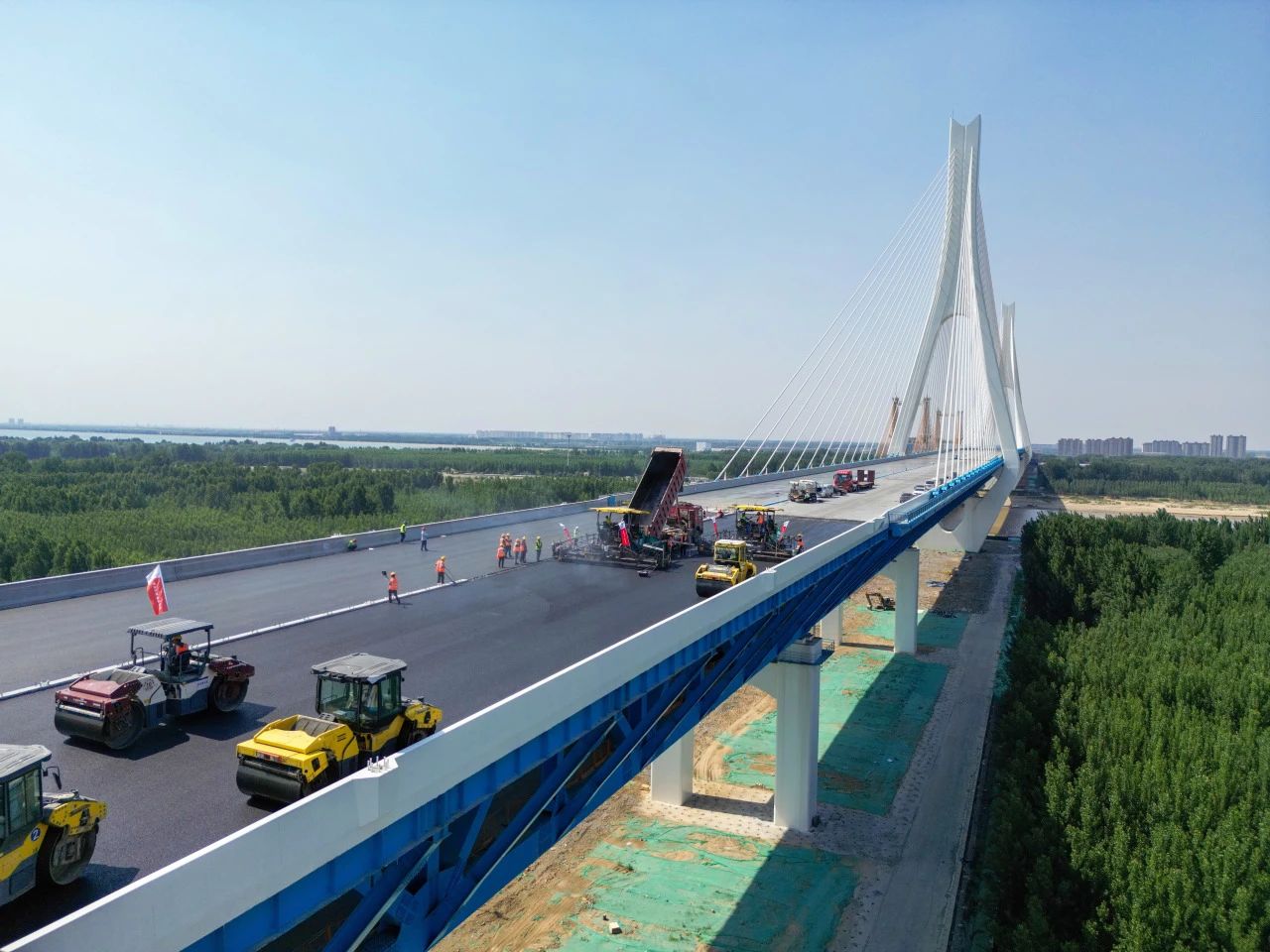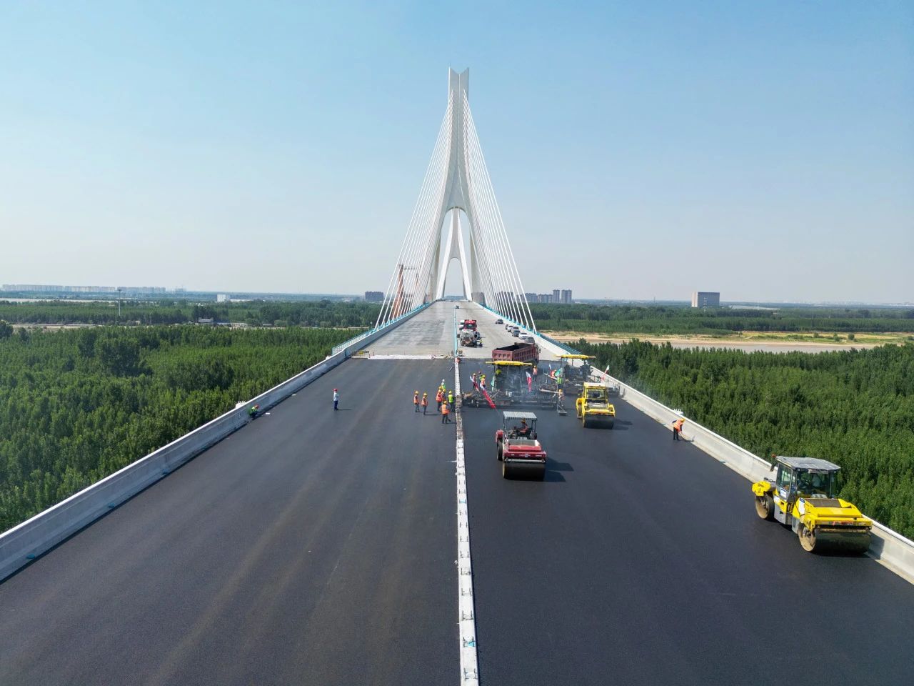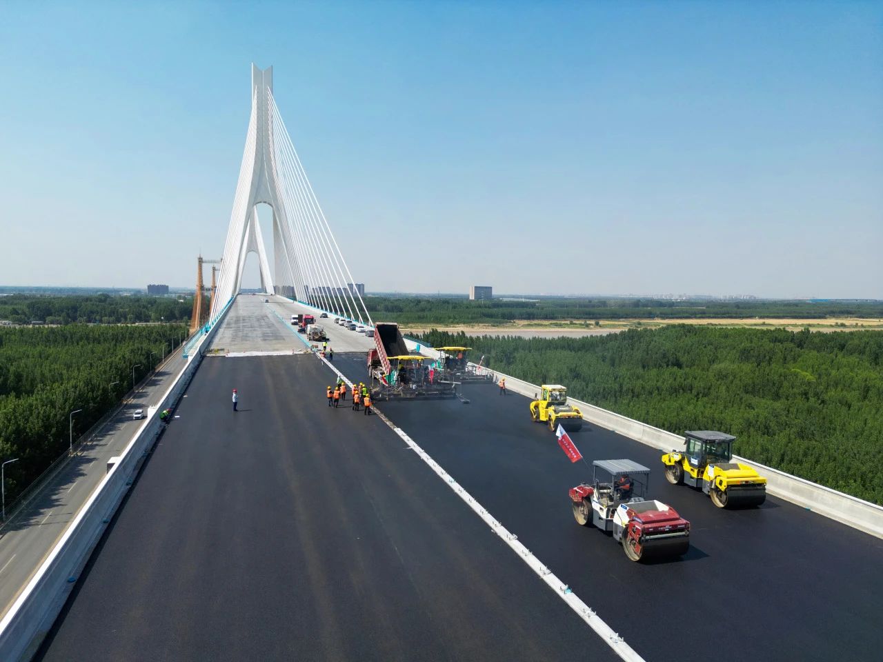 近日,由伟德国际1949承建的G104京岚线济南黄河公路大桥扩建工程的桥面沥青摊铺工作已全面展开。目前,大桥北岸桥面沥青铺设已经完成,南岸的摊铺工作也正在紧锣密鼓地进行中,标志着大桥距离正式通车又迈出了坚实的一步。