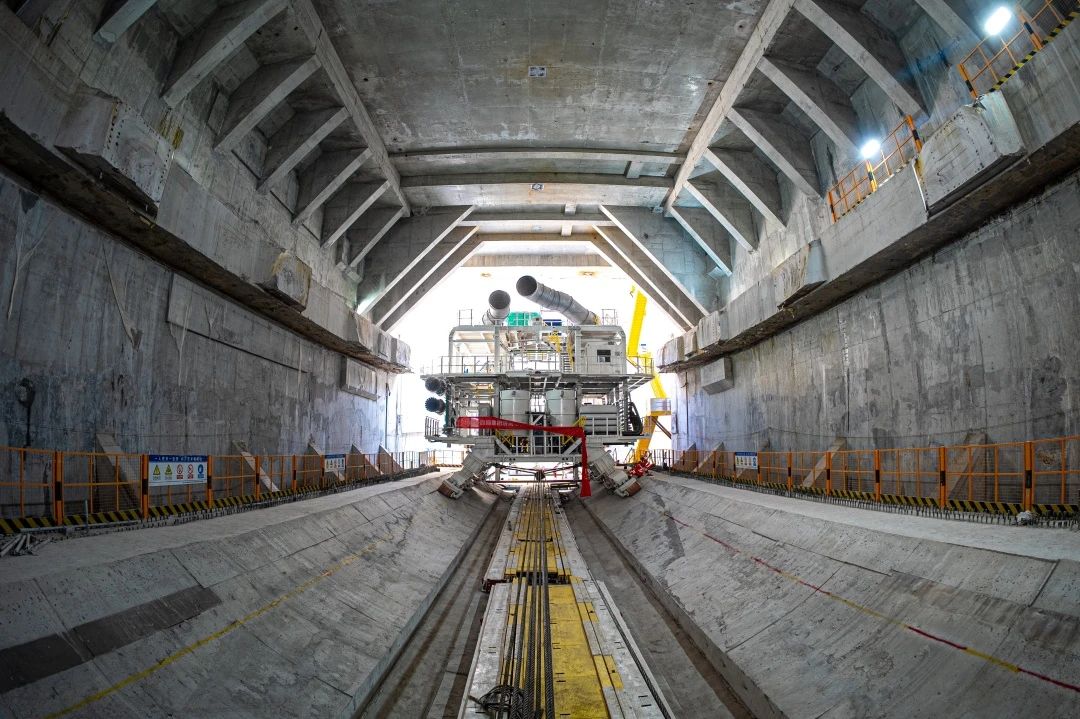 负责盾构施工的“山河号”泥水平衡盾构机,最大开挖直径达17.5米,相当于6层楼的高度,盾构机总长163米、重5200吨、装机总功率12580千瓦。