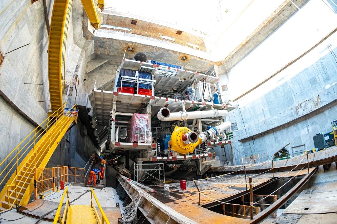 盾构机整体主要由刀盘、12块盾体、主驱动、拼装机、桥架、四节后配套台车及附属部件组成,按照施工计划“山河号”6月底完成1号台车吊装工作,7月完成主驱动、刀盘吊装,8月完成拼装,力争9月实现盾构始发。