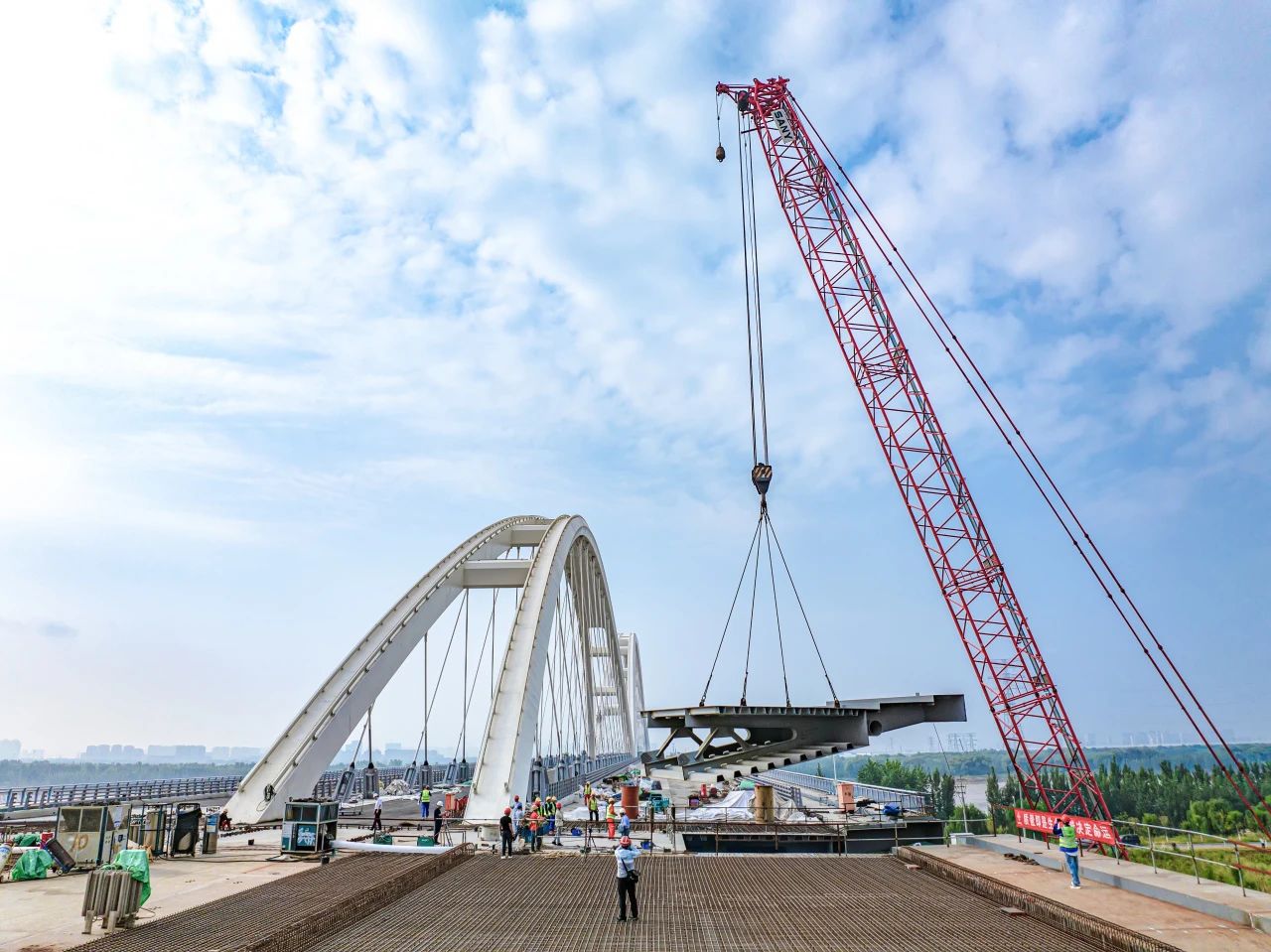 济南黄河齐鲁大桥为黄河之上首座下承式网状系杆拱桥,主跨径达420米、宽60.7m,创世界同类型桥梁最大跨径、最大梁宽,其400Mpa超高应力幅拉索在桥梁建设领域首次研发应用。