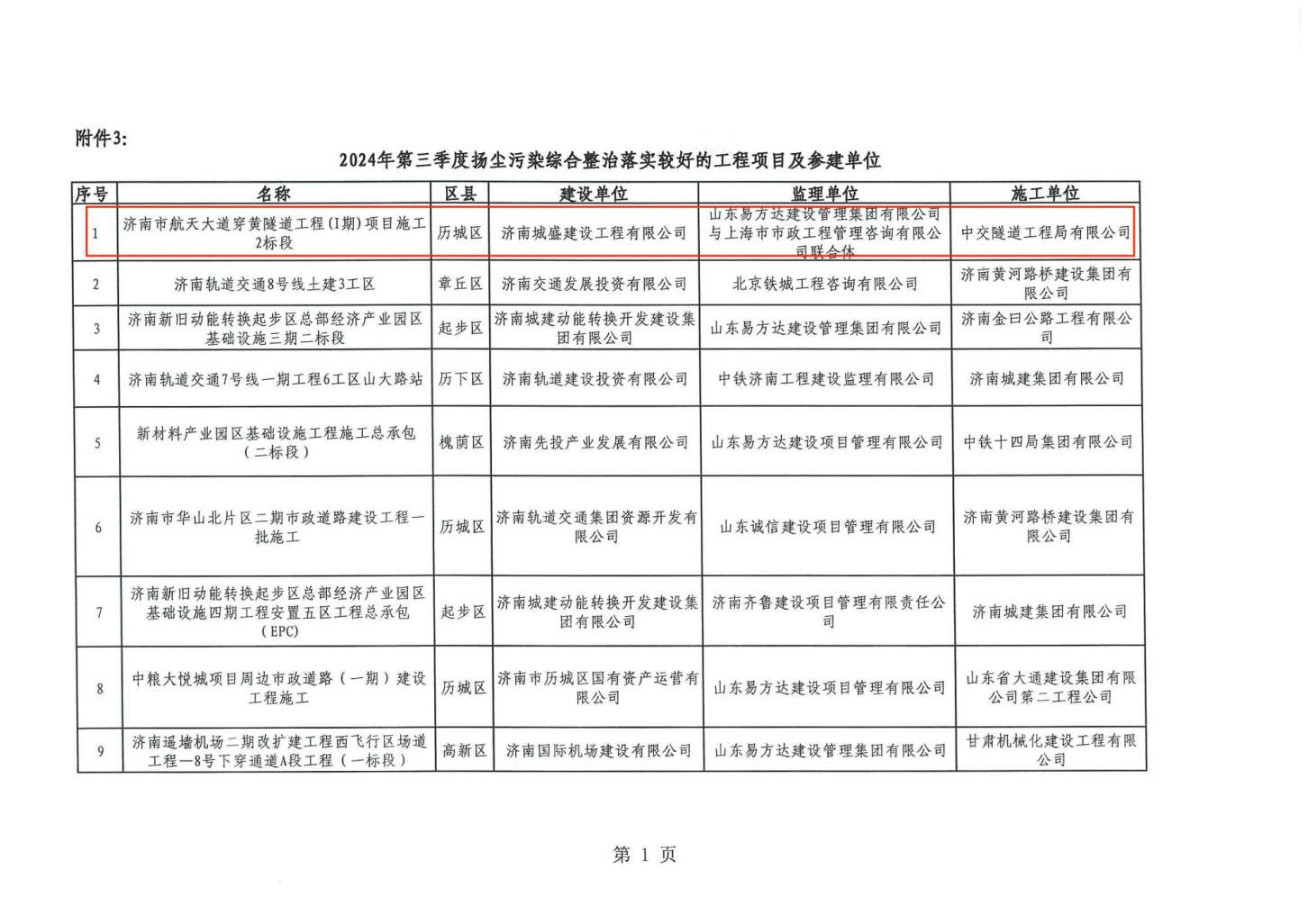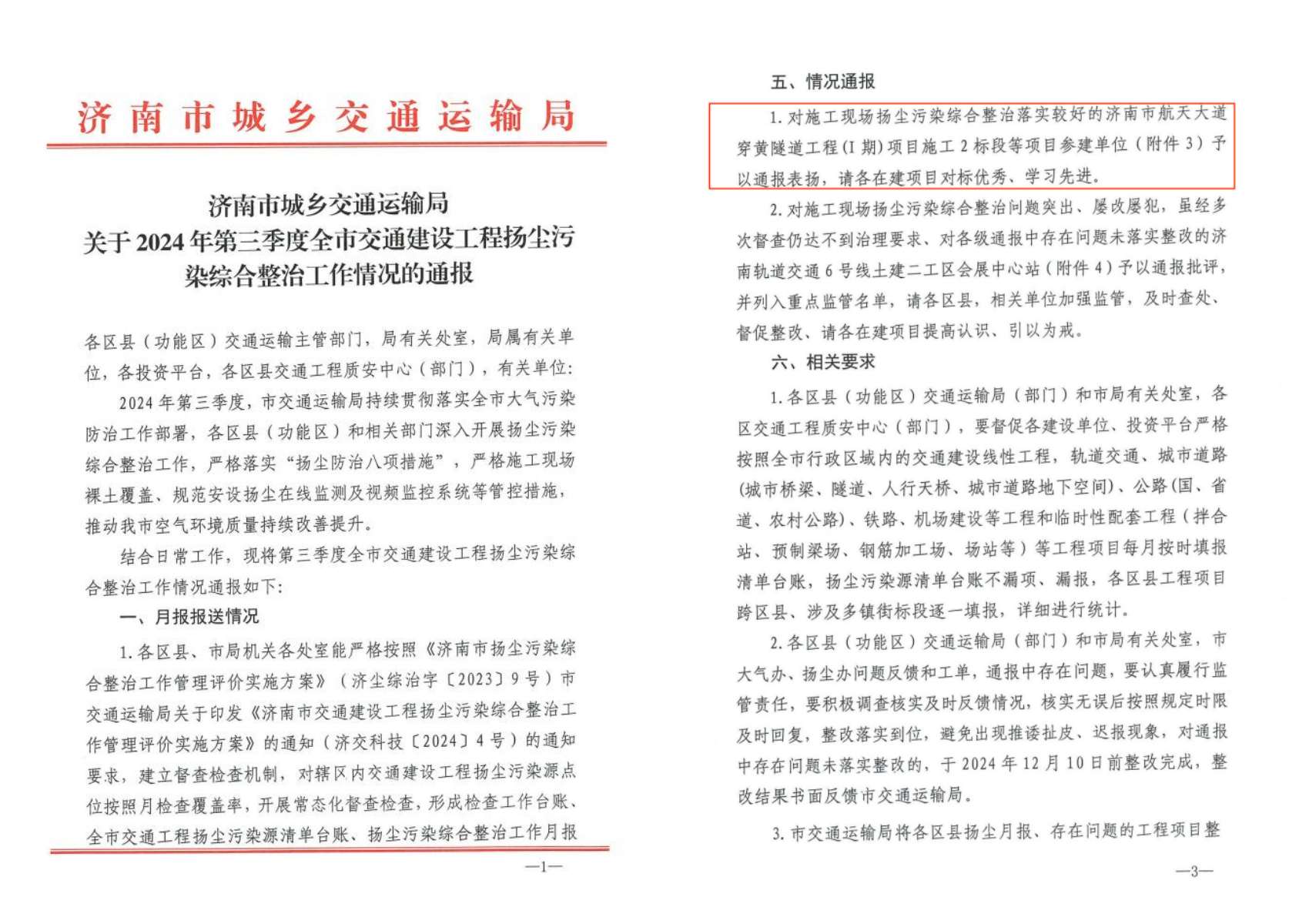 近日,济南市城乡交通运输局公布了2024年第三季度交通建设工程扬尘治理通报,伟德国际1949投资建设的济南市航天大道穿黄隧道工程(I期)项目施工2标段脱颖而出,被予以通报表扬,该标段由中交隧道工程局有限公司承建。