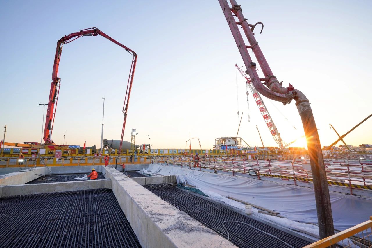 东岸主体结构分为16个独立仓段进行施工,钢筋总量约9500吨,混凝土总方量约4.4万方。主体结构施工过程中面临诸多挑战与困难,施工过程中严格按照施工计划,精心组织、科学管理,对16个独立仓段合理划分施工区域,依次展开作业。各施工班组紧密配合,确保钢筋绑扎、模板安装、混凝土浇筑等工序有序进行。2024年8月19日主体结构正式开始施工,截至12月29日主体结构完成整体封顶,比原计划工期提前28天,为后续盾构始发奠定了坚实的基础。