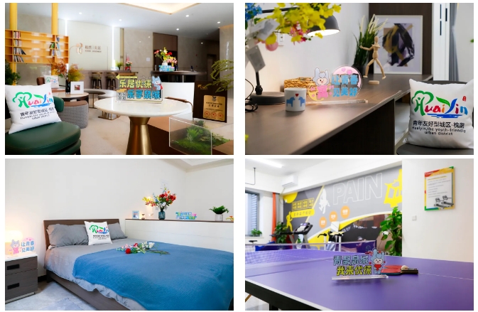 区别于普通出租公寓、酒店宾馆,根据青年喜好,植入专属LOGO 、IP形象等青春元素。房间内部配备床、衣柜、书桌椅、置物架等,并有独立卫浴、冷暖供应,青年可“拎包入住”。公共区域整体打造自助办公、学习阅读、运动健身、共享会客、休闲娱乐、自助厨房6大功能区,满足青年日常需求。